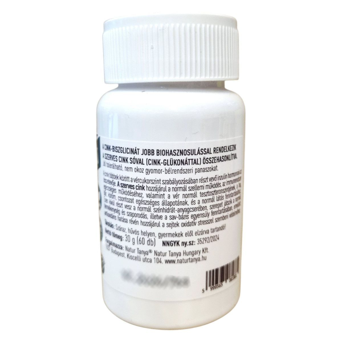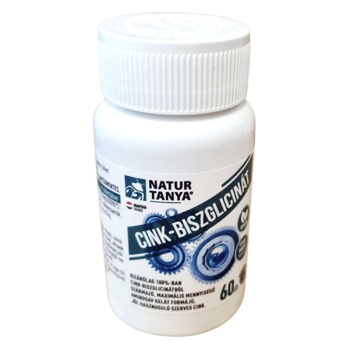 A Natur Tanya Cink-biszglicinát tabletta kizárólag 100%-ban cink-biszglicinátból származó, aminosav-kelát formájú szerves cinket tartalmaz, amely jobb biohasznosulással rendelkezik, mint a cink-glükonát. A szerves cink hozzájárulhat a normál szellemi működéshez, a látás és a bőr egészségének megőrzéséhez, valamint a normál tesztoszteronszint fenntartásához. Emellett fontos szerepet játszhat az immunrendszer normál működésében, a sejtosztódásban és az oxidatív stressz elleni védelemben. A termék titán-dioxid-mentes, vegán összetételű, laborban bevizsgált, glutén- és laktózmentes. Magyar gyártású, 100%-ban hazai fejlesztésű készítmény.