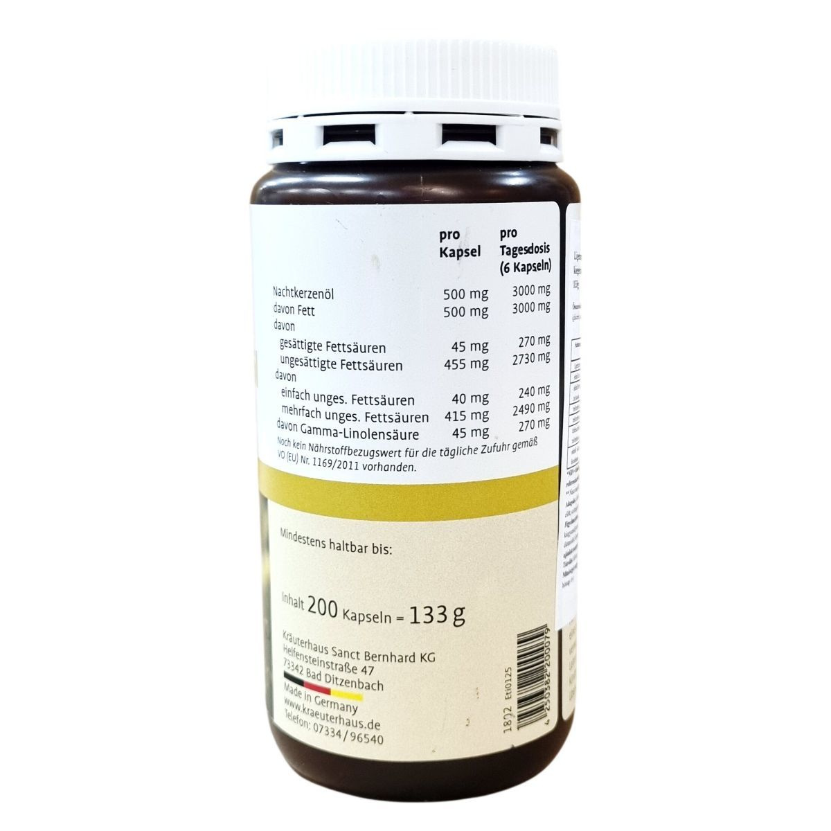 A Nachtkerzenöl kapszula ligetszépeolajat tartalmaz, amely természetes forrása a többszörösen telítetlen zsírsavaknak, köztük a gamma-linolénsavnak. A termék Németországban készült, 200 kapszulát tartalmazó kiszerelésben.