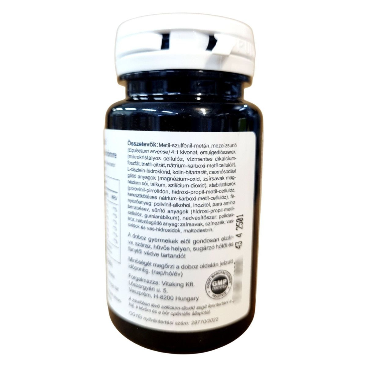 Metil-szulfonil-metán, mezei zsurló (Equisetum arvense) 4:1 kivonat, emulgeálószerek: mikrokristályos cellulóz, vízmentes dikalcium-foszfát, trietil-citrát, nátrium-karboxi-metil cellulóz, L-cisztein-hidroklorid, kolin-bitartrát, csomósodást gátló anyagok (magnézium-oxid, zsírsavak magnézium sói, talkum, szilícium-dioxid), stabilizátorok (polivinil-pirrolidon, hidroxi-propil-metil-cellulóz), keresztkötésű nátrium-karboxi-metil-cellulóz, fényezőanyagok: polivinil-alkohol, inozitol, para aminobenzoesav, színezék: titán-dioxid, nedvesítőszer: glicerin, gumiarábikum, nedvesítőszer: polietilén-glikol, aromaanyag: zsírsavak, színezék: vas-oxid és vas-hidroxid, maltodextrin.