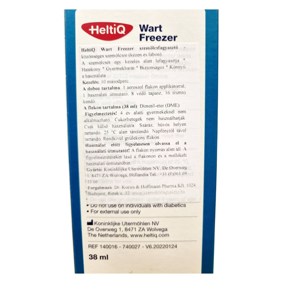 A HeltiQ Wart Freezer egy hatékony szemölcsfagyasztó készítmény, amely a közönséges szemölcsök eltávolítására szolgál kézen és lábon. A termék egy aeroszol flakont tartalmaz applikátorral, valamint 8 védő tapaszt és 16 tisztító kendőt. A kezelés mindössze 10 másodpercet vesz igénybe, és a termék gyermekbarát, biztonságos és könnyen használható. A flakon tartalma dimetil-éter, amely rendkívül gyúlékony, ezért fontos a használati útmutató alapos áttanulmányozása. A termék nem alkalmazható 4 év alatti gyermekeknél és cukorbetegeknél. A tárolás során ügyelni kell arra, hogy száraz, hűvös helyen, napfénytől távol, 25 °C alatt legyen tartva.
