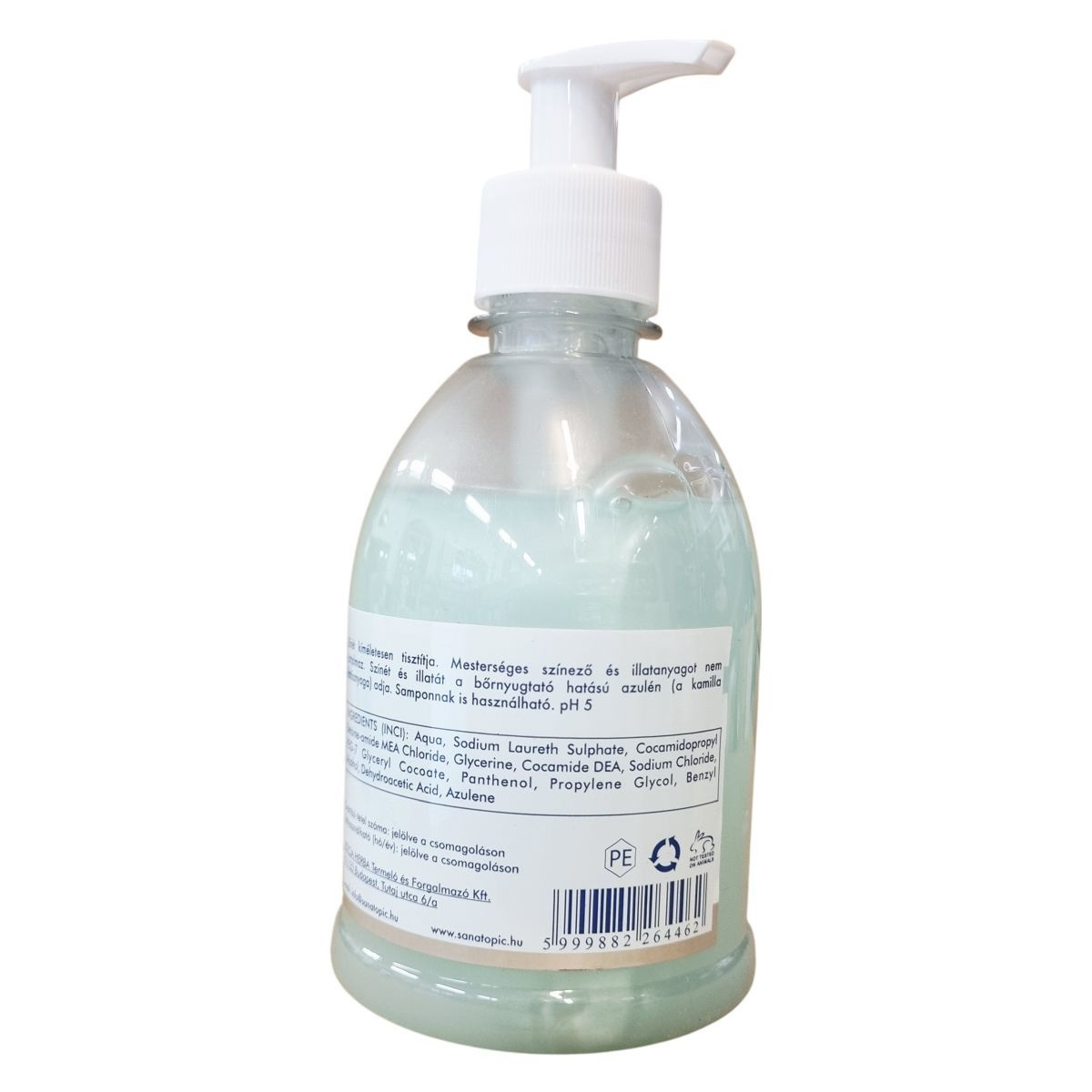 A Sanatopic folyékony szappan kíméletes bőrtisztítóhatással rendelkezik, pH-értéke 5, így használata nem irritálja a bőrt. Termékünk nem tartalmaz mesterséges színező- és illatanyagokat, színét és illatát az azulénnek köszönheti, amely a kamilla egyik hatóanyaga, bőrnyugtató hatású. A termék samponként is kiválóan alkalmazható, többfunkciós, praktikus kozmetikumként szolgál. A csomagoláson megtalálható a gyártási tételszám és a felhasználhatósági idő is. A készítményt állatkísérletekkel nem tesztelték, környezetbarát csomagolásban kerül forgalomba.