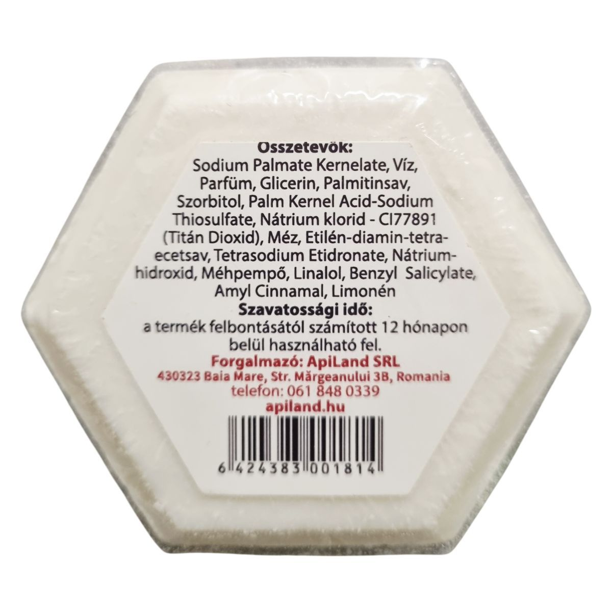 Az ApiLand mézes szappan méhpempővel készült változata természetes méhészeti összetevőket tartalmaz, így a mézet és a méhpempőt, amelyek hagyományosan kedvelt elemei a bőrápolási termékeknek. A szappan összetételében több növényi és ásványi komponens található, például nátriumsók, glicerin, palmitinsav, valamint CI77891 (titán-dioxid) színezőanyag. Illatanyag-allergént is tartalmaz (linalool, benzyl salicylate, amyl cinnamal, limonén). A szappan hexagon alakú és 100 g tömegű.