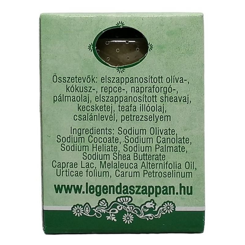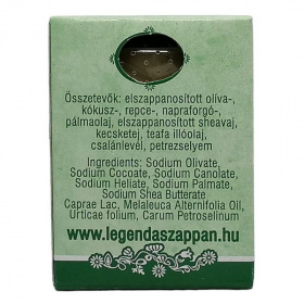 Összetevők: elszappanosított kókusz-, pálma-, olíva-, napraforgóolaj, víz/kecsketejből, glicerin*, teafa illóolaj, petrezselyem.