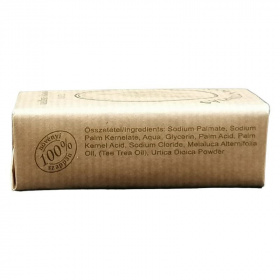 Teafa: ez a szappan, teafa illóolajtartalmának köszönhetően, természetes baktériumölő hatású. Arctisztításra is kiváló, mert lágyan, kíméletesen tisztít, és alkalmas pattanások, pikkelysömör, bőrgyulladások és kisebb bőrproblémák kezelésére is. Összetevők: víz, glicerin, teafaolaj, konyhasó, csalánőrleménnyel festve.