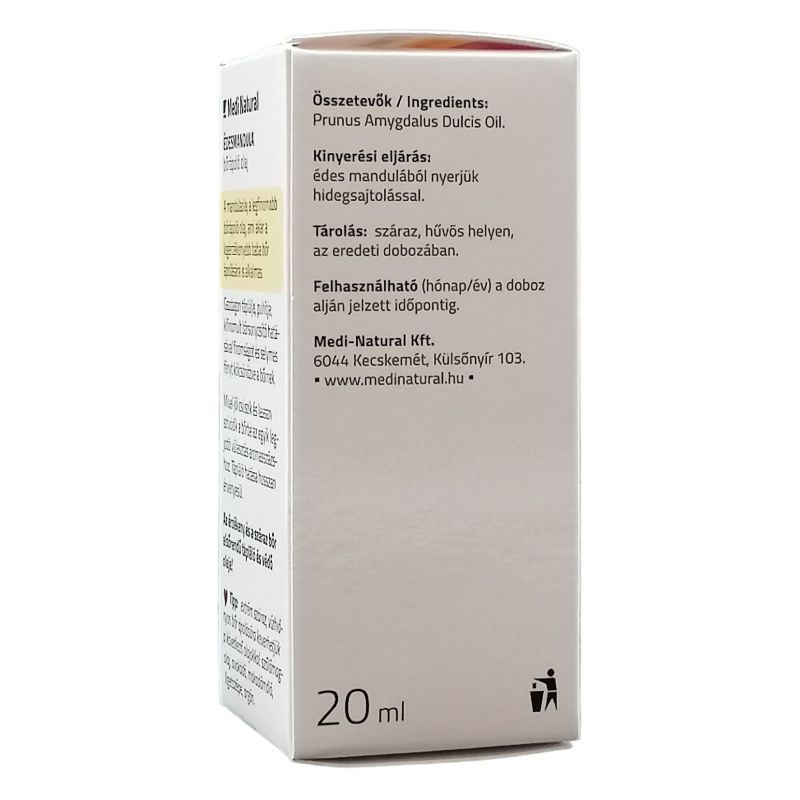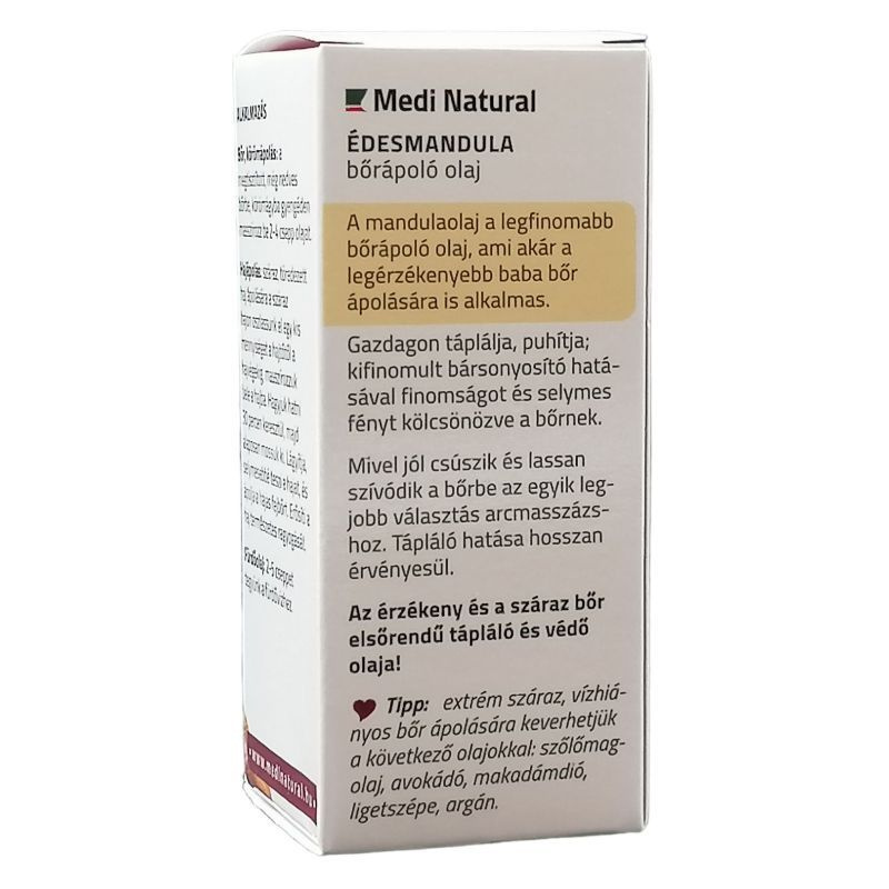 A mandulaolaj érzékeny és száraz bőr elsőrendű tápláló és védő olaja, amely ideális az irritált és kiszáradt bőr regenerálására. Nyugtató hatása azonnali felüdülést hoz a dehidratált, hámló, viszkető bőrnek - gombás bőrfertőzések esetén is enyhíti a tüneteket, gyorsítja a bőrsejtek gyógyulási folyamatait még az ekcéma esetén is. A mandulaolaj puhítja a sarok, talp vagy könyök felületén megkeményedett bőrt. A mandulaolaj használható önmagában vagy illóolajokkal keverve testápolásra is. Kiválóan vegyül az illóolajokkal ezért tökéletes választás hordozóolajként aromaterápiás felhasználásra.