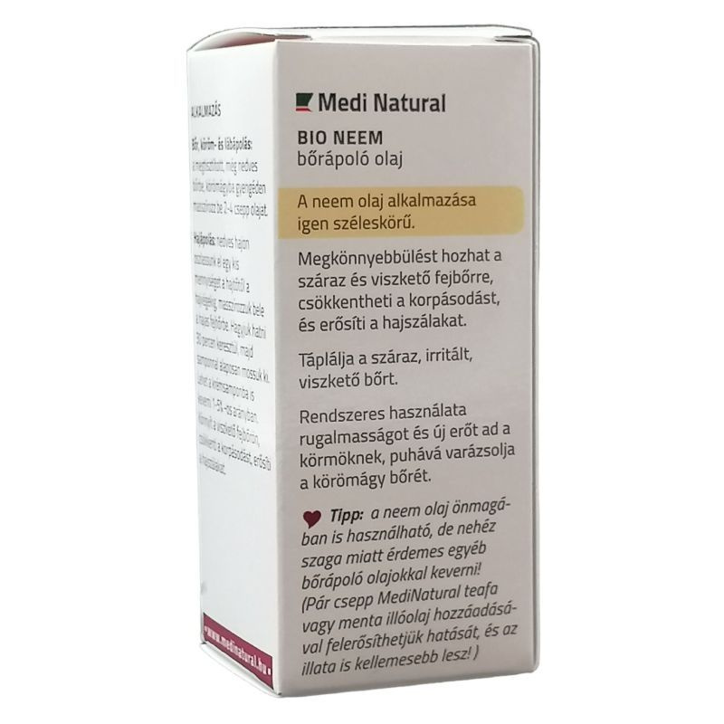 A Neem bőrápoló olaj erős gyulladáscsökkentő, valamint parazita, gomba, baktériumellenes és rovarriasztó hatóanyagai alkalmassá teszik használatát, olyan bőrbántalmak esetén is, mint: korpa, körömgomba, pattanás ekcéma, hegek, gyulladt bőr, csalánkiütés szemölcsök, herpesz, tetvesség és egyéb bakteriális és vírusos bőrbetegségek esetén.
