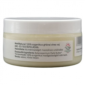 A MediNatural ghánai shea vaj összetétele sokban hasonlít az emberi bőrt védő természetes emulzió összetételére. Sztearin-és olajsav mellett esszenciális zsírsavakat, E-vitamin, béta karotin és allantoint, valamint gyulladáscsökkentő triterpénalkoholokat tartalmaz. A bőrben felszívódva hosszan tartó hidratáló hatást fejt ki, serkenti a bőr öngyógyító képességét.
