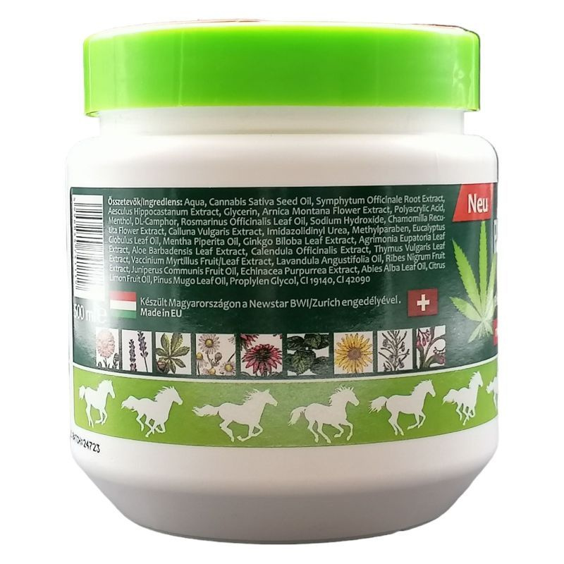 Összetevők: Aqua, Cannabis Sativa Seed Oil, Symphytum Officinale Root Extract, Aesculus Hippocastanum Extract, Glycerin, Arnica Montana Flower Extract, Polyacrylic Acid, Menthol, DL-Camphor, Rosmarinus Officinalis Leaf Oil, Sodium Hydroxide, Chamomilla Recutita Flower Extract, Calluna Vulgaris Extract, Imidazolidinyl Urea, Methylparaben, Eucalyptus Globulus Leaf Oil, Mentha Piperita Oil, Ginkgo Biloba Leaf Extract, Agrimonia Eupatoria Leaf Extract, Aloe Barbadensis Leaf Extract, Calendula Officinalis Extract, Thymus Vulgaris Leaf Extract, Vaccinium Myrtillus Fruit/Leaf Extract, Lavandula Angustifolia Oil, Ribes Nigrum Fruit Extract, Juniperus Communis Fruit Oil, Echinacea Purpurrea Extract, Abies Alba Leaf Oil, Citrus Limon Fruit Oil, Pinus Mugo Leaf Oil, Proplylen Glycol, CI 19140, CI 42090.