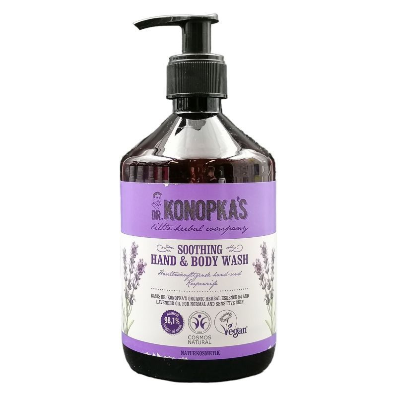 Nyugtató hatású tusfürdő és kézmosó normál és érzékeny bőrre, mely értékes összetevői (Dr. Konopka 54. számú speciális gyógynövény-esszenciája, bio levendulaolaj) révén nemcsak tisztítja a bőrt, de nyugtatja, hidratálja és táplálja is azt. A nyugtató levendulaolajnak köszönhetően pedig oldja a feszültséget és a stresszt is. BDIH minősítésű, vegán termék. Dr. Konopka eredeti gyógynövényeken alapuló bőr-, haj- és szépségápolási receptjei több évtized után most életre kelnek a modern technológia segítségével!