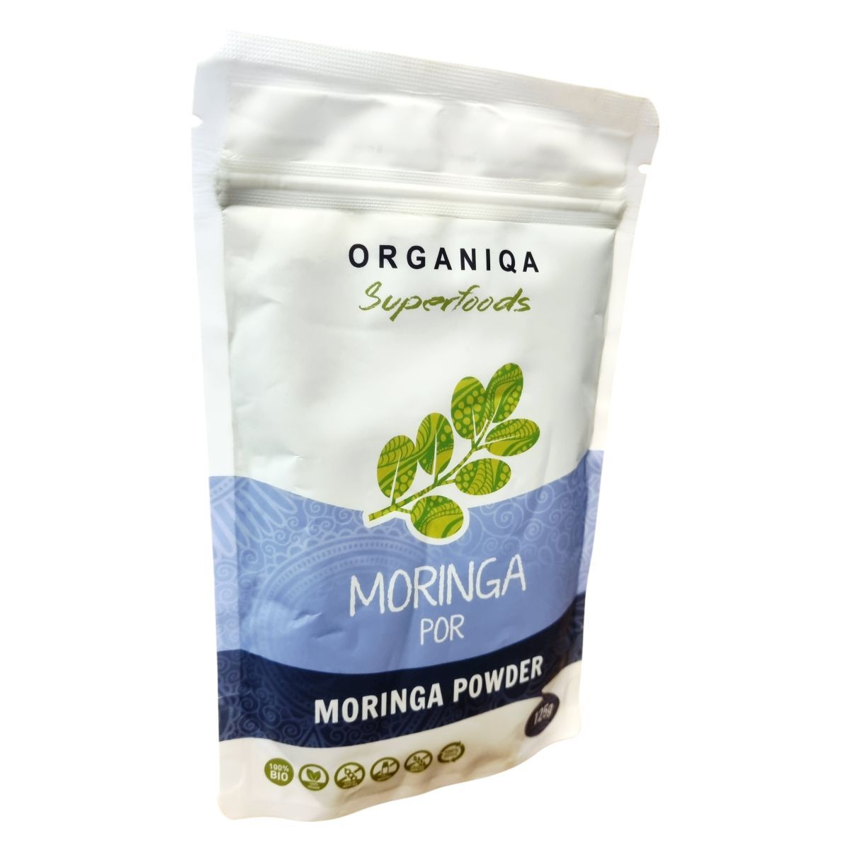 A moringa fa Indiában őshonos, és az ayurvédikus orvoslásban 300-féle betegség esetén javasolják. A moringa por Ázsiából származik, ahol a növény minden részét felhasználják. Európában leginkább a zöld leveleiből készült őrleményt fogyasztják. A termék 100% újrahasznosítható tasakban kapható, és ellenőrzött ökológiai gazdálkodásból származik, amit a Biokontroll Hungária Nonprofit Kft. ellenőriz.