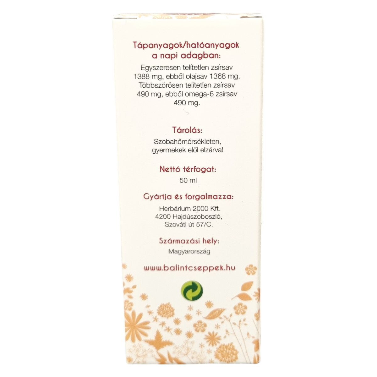 A készítmény több mint 50%-ban tartalmaz egyszeresen telítetlen zsírsavat, többszörösen telítetlen zsírsavai közül omega-6 telítetlen zsírsavat. A termék Magyarországon készül, és 50 ml kiszerelésben kerül forgalomba.