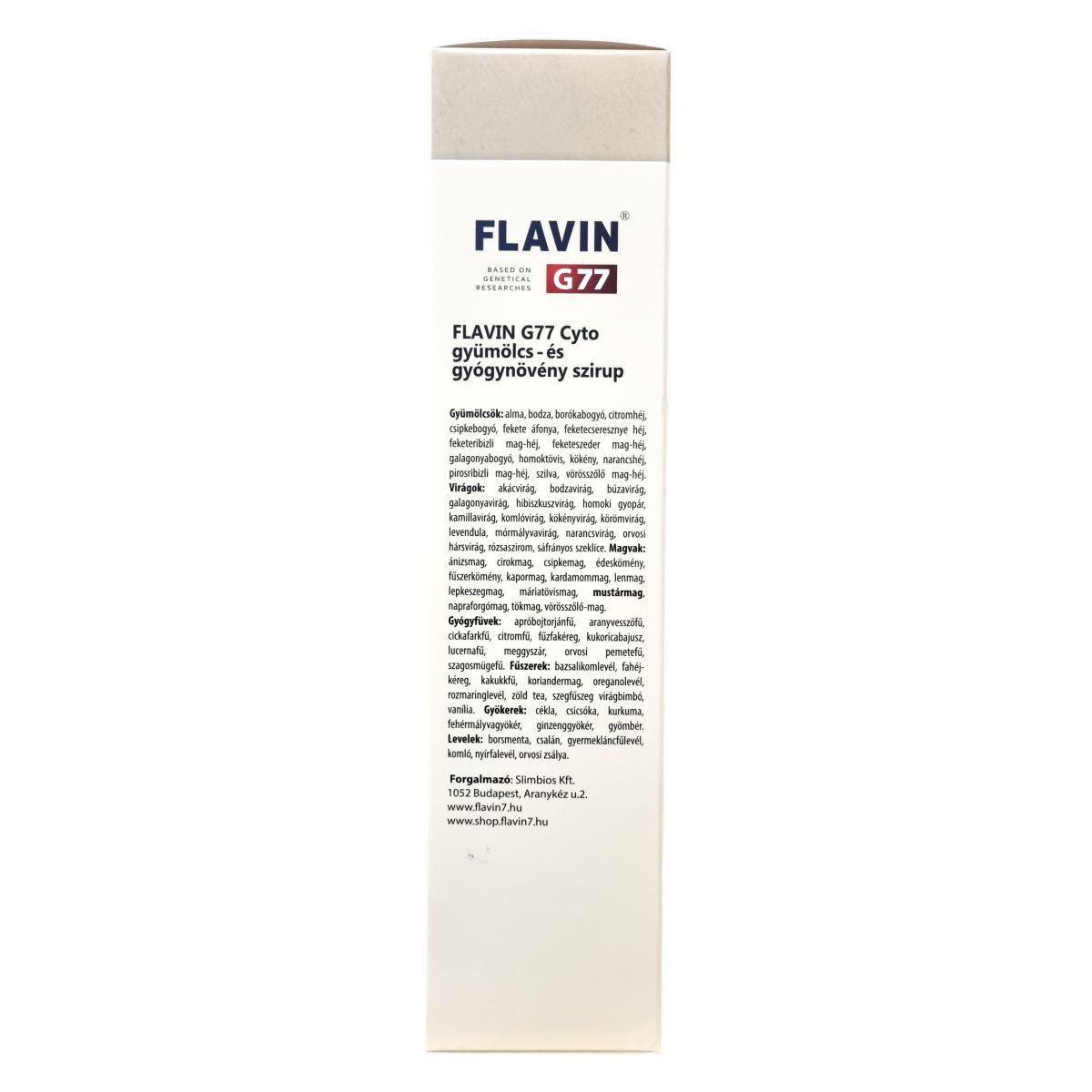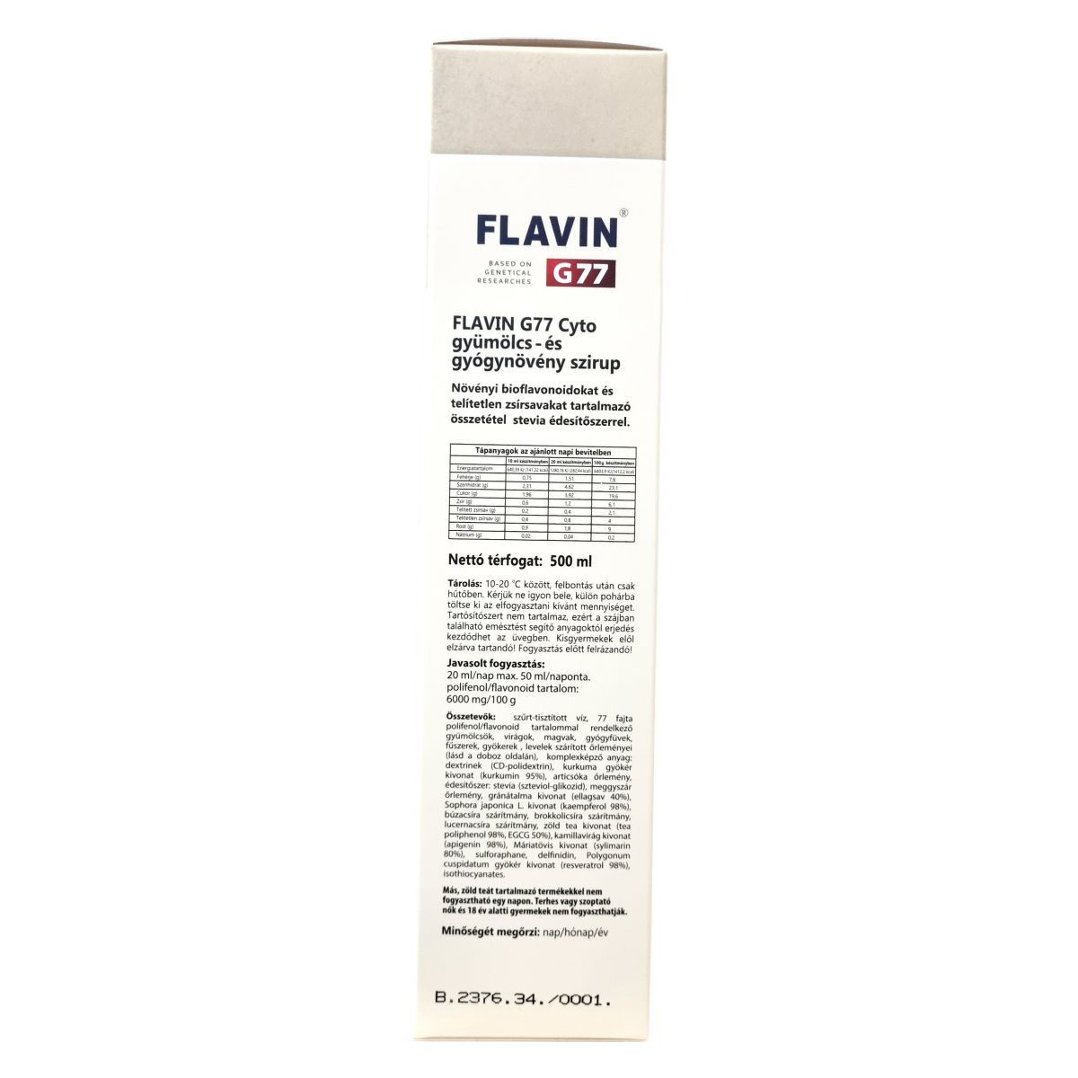 A Flavin G77 Cyto gyümölcs- és gyógynövény szirup egy gondosan összeállított termék, mely a genetikai kutatások eredményeire alapozva kínál különleges növényi hatóanyagokat. A 77 féle gyümölcs, virág, magvak, gyógynövény, fűszer, gyökér és levél szárított őrleményei egy komplex, természetes formula részei, melyek bioflavonoidokban és telítetlen zsírsavakban gazdagok. Összetételében szerepelnek többek között kurkuma gyökér kivonat, articsóka őrlemény, gránátalma kivonat, Sophora japonica, búzacsíra, brokkolicsíra, lucernacsíra, zöld tea kivonat, kamilla, máriatövis, Polygonum cuspidatum gyökér kivonat és más természetes összetevők. A termék nem tartalmaz tartósítószert, ezért fogyasztás előtt fel kell rázni, és az erjedés elkerülése érdekében mindig tiszta pohárba ajánlott önteni. A készítmény nem ajánlott várandós vagy szoptató nőknek, valamint 18 év alatti gyermekeknek, illetve nem fogyasztható együtt más zöld teát tartalmazó termékekkel azonos napon. Kisgyermekek elől elzárva szükséges tárolni. A palack 500 ml térfogatú, 10-20 °C között, hűtve tárolandó.