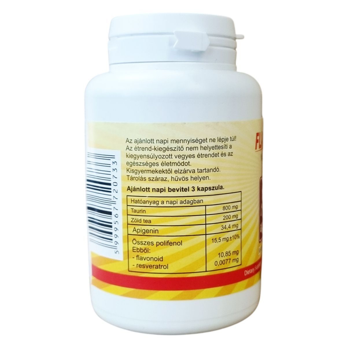taurin, Flavin7 bioflavonoid komplex (vörösszőlő mag-héj szárítmány, cirok mag-héj szárítmány, feketeszeder mag-héj szárítmány, fekete cseresznye héj szárítmány, feketeribizli mag-héj szárítmány, pirosribizli mag-héj szárítmány, szilvahéj szárítmány, almahéj szárítmány), HPMC kapszula (hipromellóz, cink-oxid, sűrítőanyag: karragén, emulgeálószer: glicerin), zöld tea, kamillavirág extract (apigenin 98%)