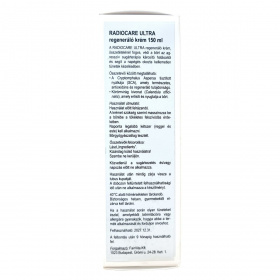 A RadioCare Ultra egy speciálisan sugárterápiák után kifejlesztett bőrvédő és regeneráló krém. Hatékonyságát a SCA® nevű természetes aktív összetevő antioxidáns és regeneráló hatásának, valamint a körömvirág (Calendula officinalis) nyugtató, helyreállító tulajdonságainak köszönheti. Használata javasolt reggel és este, felrázás után, bőrbe masszírozva a teljes felszívódásig. A termék kizárólag külsőleg alkalmazható, kerülni kell a szemmel való érintkezést, és nem ajánlott közvetlenül sugárkezelés vagy napozás előtt használni. Parabénmentes és bőrgyógyászatilag tesztelt. Gondos tárolás mellett, 40°C alatt, gyermekek elől elzárva biztosítható a minősége.