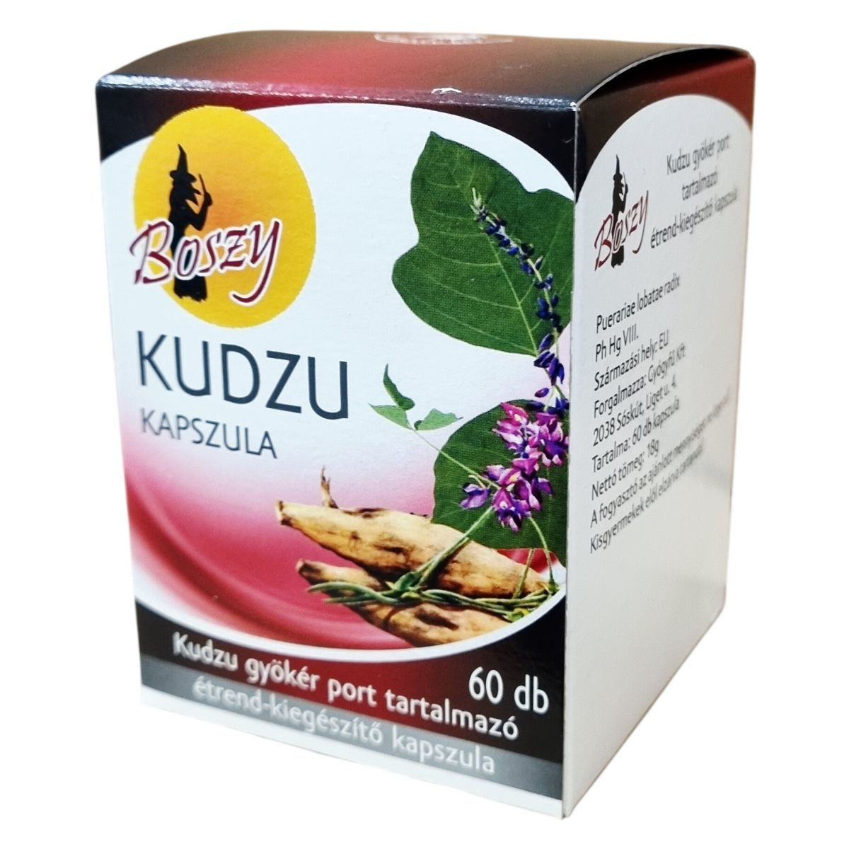 A Boszy Kudzu kapszula kizárólag európai eredetű kudzu gyökér porát tartalmazza (Puerariae lobatae radix, Ph Hg VIII.). Egy csomagban 60 darab kapszula található, nettó tömege 18 gramm. A gyártási kód 10-7-14-1-. A kapszula összetevői között a zselatin is szerepel. A termék fogyasztása mellett ajánlott a kiegyensúlyozott és vegyes táplálkozás és az egészséges életmód fenntartása.