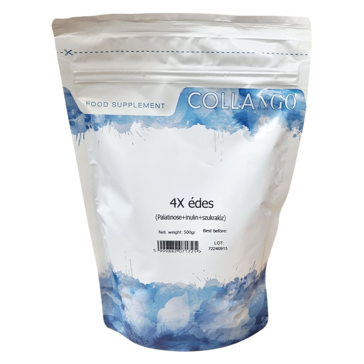 A COLLANGO termék 500 grammos kiszerelésben kapható táplálékkiegészítő, amely palatinózt, inulint és szukralózt tartalmaz. Az összetevők közül a palatinóz egy lassan felszívódó szénhidrát, az inulin oldható rost forrás cikóriából, míg a szukralóz egy kalóriamentes édesítőszer. Az allergén figyelmeztetés szerint a termék olyan üzemben készül, ahol tej, tojás, szója, glutén, mogyoró, hal és rákfélék is feldolgozásra kerülnek. A tápanyag-összetétel alapján a termék energiaértéke 371 kcal 100 grammonként, zsiradékot, cukrot és fehérjét nem tartalmaz, viszont jelentős rosttartalommal rendelkezik. A COLLANGO a Hofood Kft. forgalmazásában érhető el.
