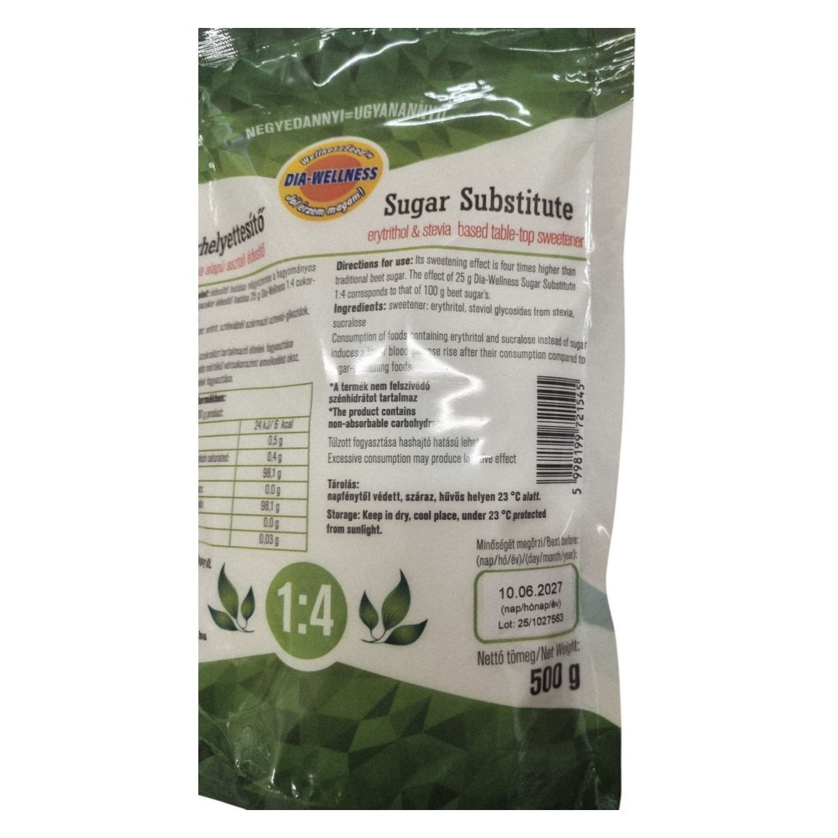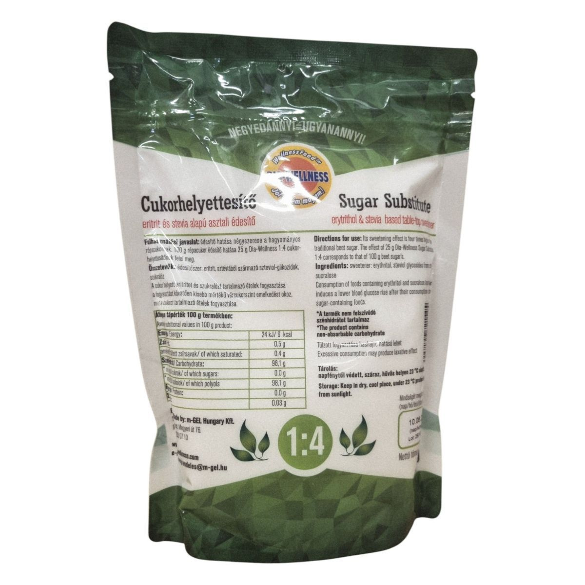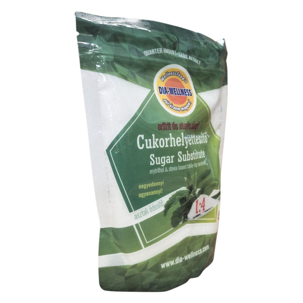 Édesítő hatása négyszerese a kristálycukorénak. 25 g Dia-Wellness 1:4 cukorhelyettesítő kb. 100 g cukor édesítőhatásának felel meg.