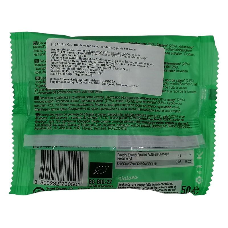 Összetevők: gluténmentes zabpehely* (31%), kesudió* (25%), kókuszvirág nektár*, kókuszolaj*, kendermag*(8%), kakaópor*(3,7%), kenderfehérje (2,8%)*, Bourbon vanília*.* Biogazdálkodásból származó összetevő.