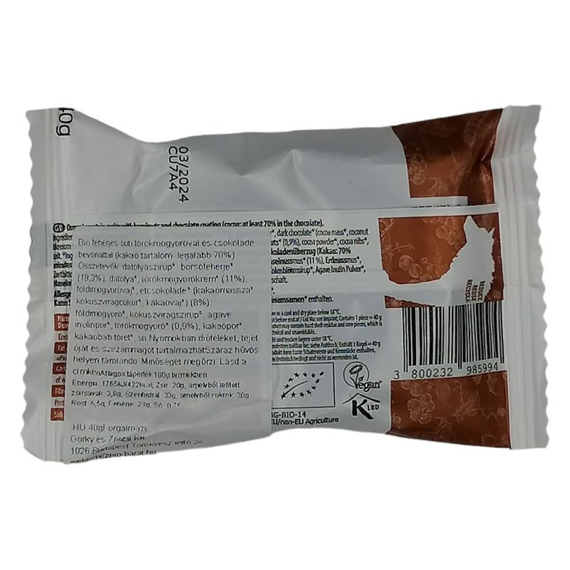 Összetevők: datolyaszirup*, borsófehérje* (19,3%), datolya*, törökmogyorókrém* (11%),földimogyoróvaj*, étcsokoládé* (kakaómassza*, kókuszvirágcukor*, kakaóvaj*) (8%), földimogyoró*,kókuszvirágszirup*, agavé inulinpor*, törökmogyoró* (0,9%), kakaópor*, kakaóbab töret*, só.*Összetevők bio gazdálkodásból