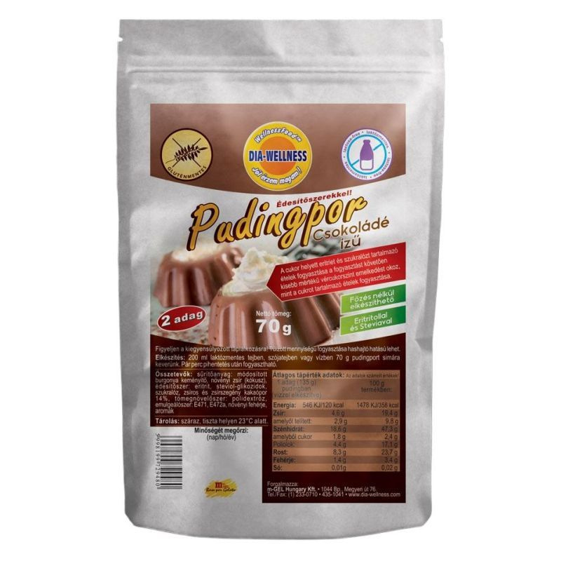 Felhasználási javaslat: 200 ml laktózmentes tejben, szójatejben vagy vízben 70 g pudingot simára keverünk. Pár perc pihentetés után fogyasztható.