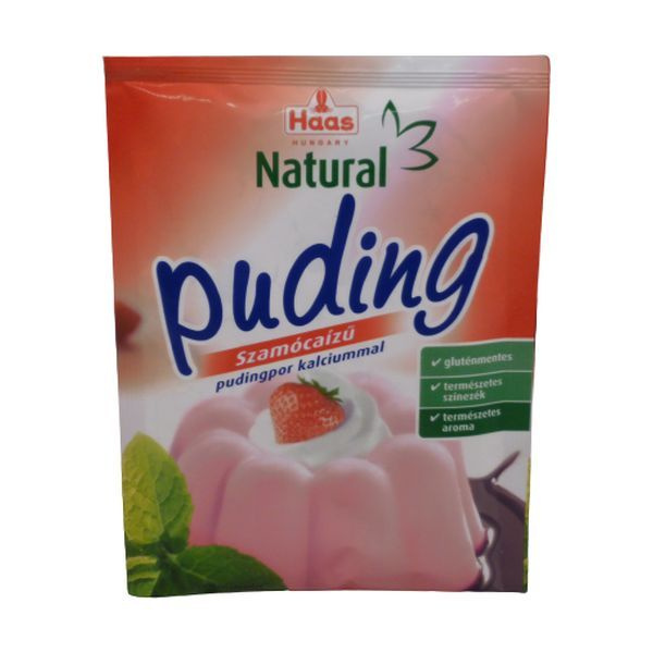 Haas gluténmenets puding szamóca natural megújult receptúra, gluténmentes, kalciummal kiegészítve, természetes kármin extrakt színezék és természetes szamóca aroma felhasználásával.