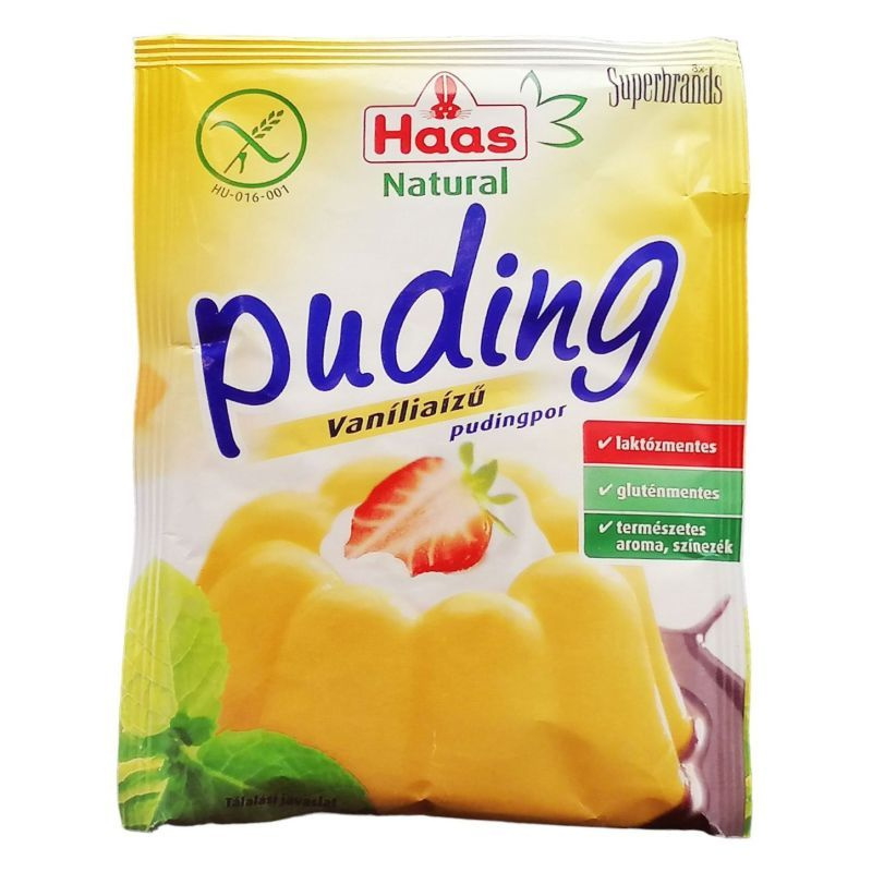 Haas gluténmentes puding vanília natural gluténmentes, természetes karotin színezék és természetes vanília aroma felhasználásával.