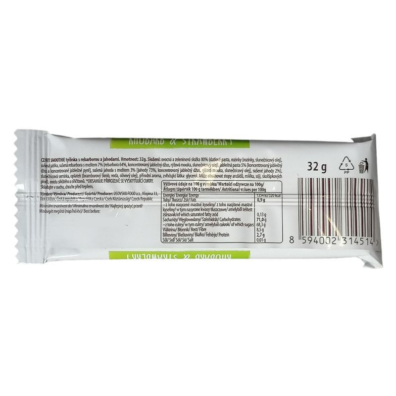 Összetevők: gyümölcs és zöldség keverék 93% (datolyapaszta, mazsola [mazsola, napraforgó olaj], szárított alma, szárított rebarbara musttal 6% [rebarbara 64%, koncentrált almalé, rizsliszt, napraforgó olaj], szárított eper musttal 3% [eper 73%, koncentrált almalé, rizsliszt, napraforgó olaj], szárított eper 1%), ostya (burgonyakeményítő, víz, olívaolaj), természetes aroma. Nyomokban földimogyorót, tejet, szóját, száraz csonthéjas gyümölcsöket, kén-dioxidot és szulfitokat tartalmazhat.