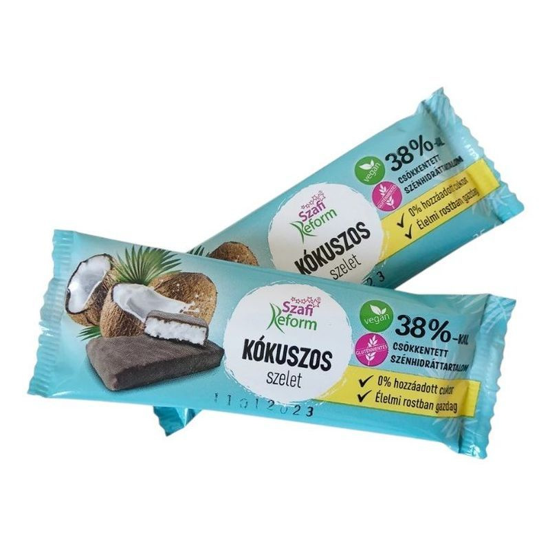 Kókuszos szelet étcsokoládéba (20%) mártva, édesítőszerekkel.
