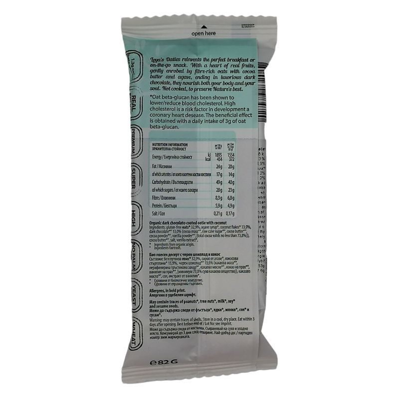 Összetevők: Gluténmentes zab* 34,5%, agavészirup*, datolya*, étcsokoládé* 13% (kakaómassza 64%, nyers nádcukor 28,6%, kakaóvaj 7%, emulgeálószer: szójalecitin 0,4%, vaníliakivonat 0,03%), kókuszpehely* 12,5%, kakaóvaj*, Himalája só, vaníliaaroma*. *organikus gazdálkodásból.