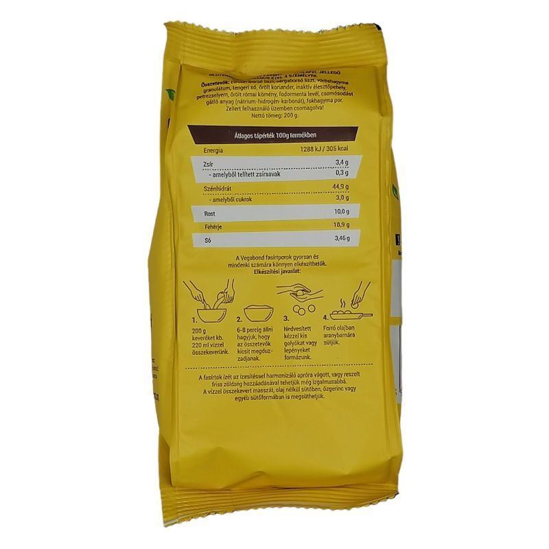 Összetevők: csicseriborsó liszt, sárgaborsó liszt, vöröshagyma granulátum, tengeri só, őrölt koriander, inaktív élesztőpehely, petrezselyem, őrölt római kömény, fodormenta levél, csomósodást gátló anyag (nátrium hidrogén karbonát) fokhagymapor.