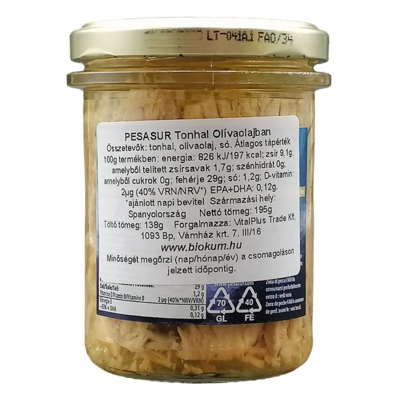 A termék válogatott tonhaldarabokat és olívaolajat tartalmaz, tartósítószer nélkül.