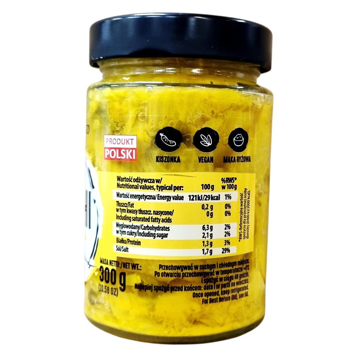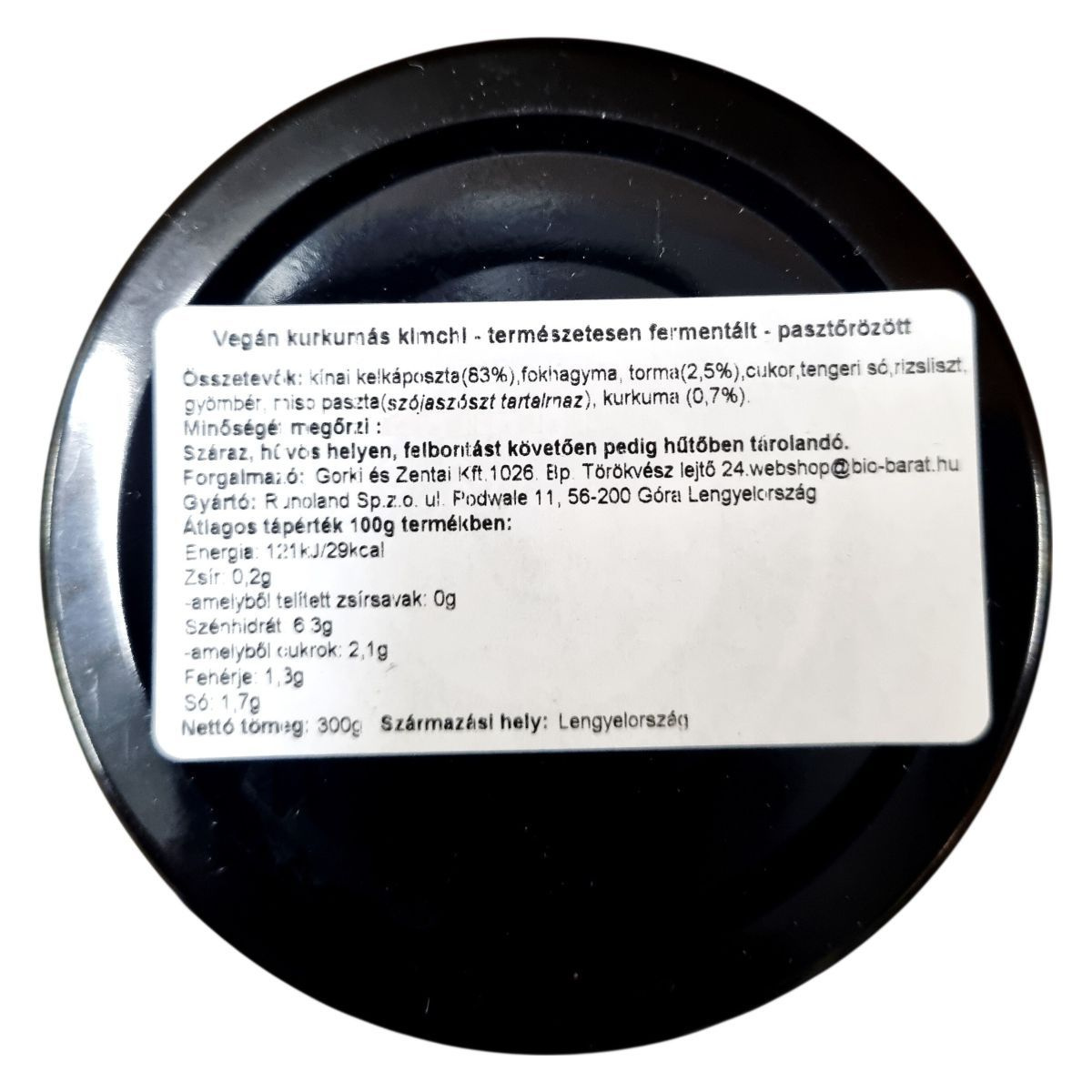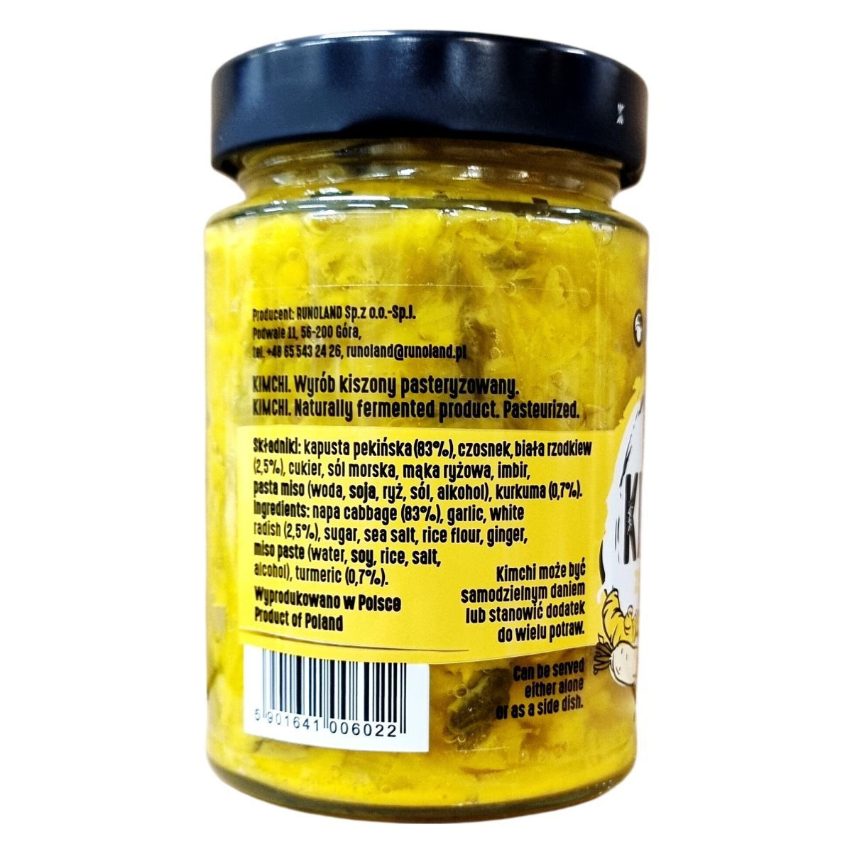 A RUNOLAND vegán kurkumás kimchi egy pasztőrözött, természetesen fermentált termék, amelyet Lengyelországban gyártanak. Fő összetevői között szerepel a kínai kelkáposzta, fokhagyma, fehér retek, valamint speciális adalékok, mint a rizsliszt, gyömbér és miso paszta, mely szójatartalmú. A kimchi enyhén fűszerezett kurkuma hozzáadásával készült, amely jellegzetes, kellemes aromát kölcsönöz neki. Felhasználható önálló fogásként vagy számos étel kiegészítőjeként, megőrizve jellegzetes savanykás ízét. A csomagolás 300 grammos, és ajánlott hideg, száraz helyen tárolni, illetve felbontás után gyors fogyasztása szükséges a minőség megőrzése érdekében.