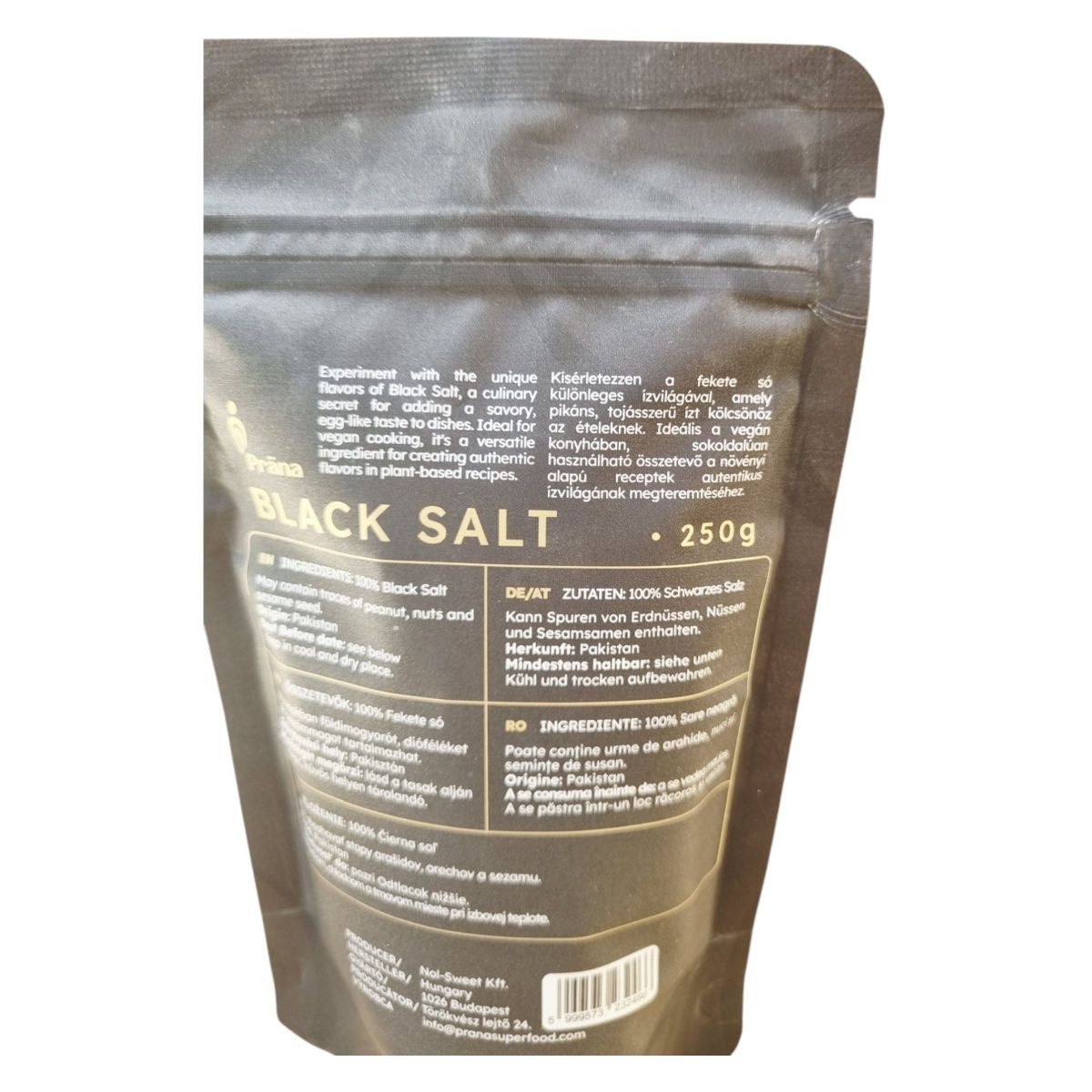 A Prána Black Salt egy különleges fekete só, amely Pakisztánból származik. Különleges, pikáns ízvilága miatt a vegán konyha egyik alapvető összetevője lehet, mivel tojásszerű ízt adhat az ételeknek. A termék 100% természetes, és gluténmentes, így különféle étrendi igényekhez is alkalmazkodhat. A gyártó Nol-Sweet Kft., amely Magyarországon található. A termék nyomokban földimogyorót, dióféléket és szezámmagot tartalmazhat, ezért allergiások számára körültekintést igényelhet.