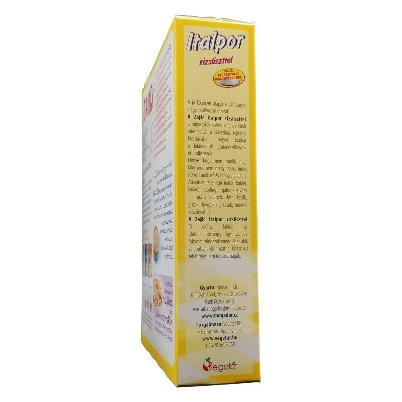 Zajic gluténmentes rizs italpor ajánljuk: reggeli italok, müzlik, tudmixok alkotórészeként, de felhasználható a legkülönfélébb főtt ételek elkészítéséhez is a tehéntej kiváltására (Pl.: édességekbe, pudingokhoz vagy főzelékbe.)