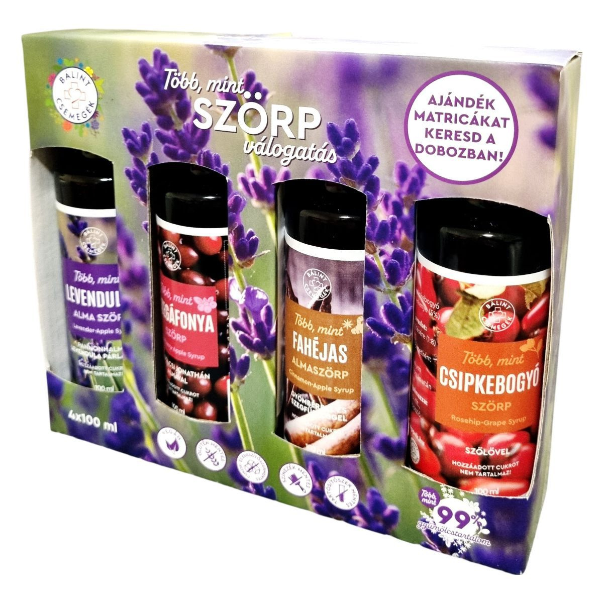 4 különleges szörp egy csomagban: levendulás alma, tőzegáfonya, fahéjas alma és csipkebogyó szőlővel. Természetes összetevőkkel, hozzáadott cukor nélkül, több mint 99% gyümölcstartalommal.