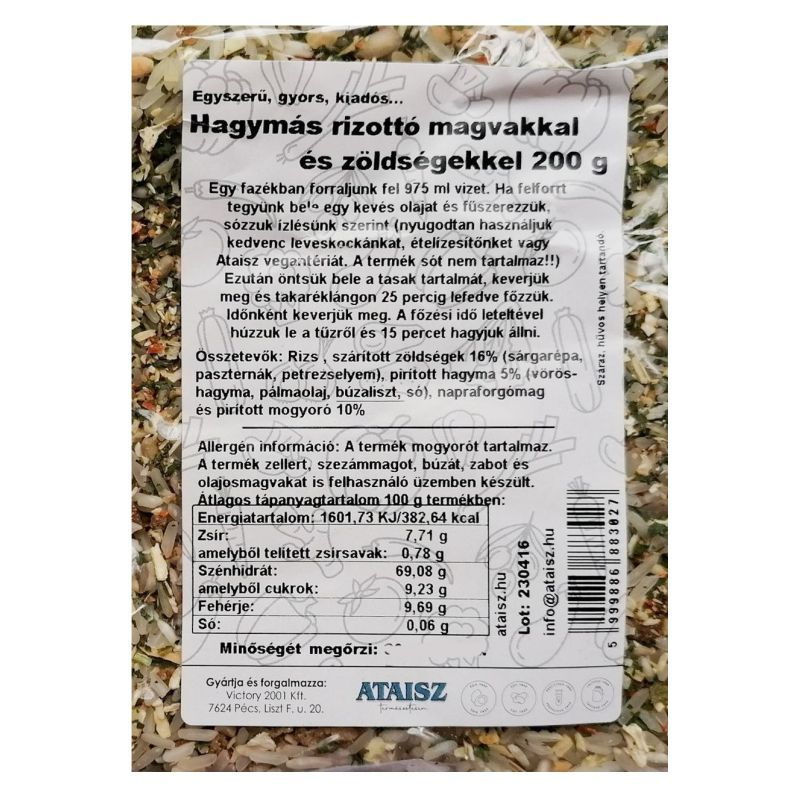 Elkészítés: egy fazékban forraljunk fel 975 ml vizet. Ha felforrt tegyünk bele egy kevés olajat és fűszerezzük, sózzuk ízlésünk szerint nyugodtan használjuk kedvenc leveskockánkat, ételízesítőnket vagy Ataisz vegantériát. (A termék sót nem tartalmaz.) Ezután öntsük bele a tasak tartalmát, keverjük meg és takaréklángon 25 percig lefedve főzzük. Időnként keverjük meg. A főzési idő leteltével húzzuk le a tűzről és 15 percet hagyjuk állni. Dúsítható vega virslivel, tofuval. Nem tartalmaz: aromát, fűszerkivonatot, tartósítót.
