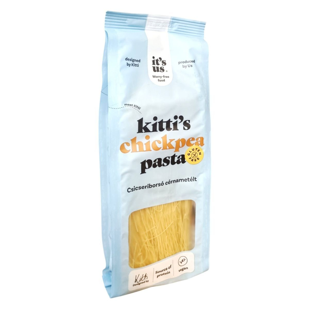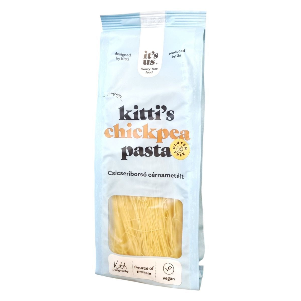A Kitti’s Chickpea Pasta cérnametélt csicseriborsó alapú, magas növényi fehérje- és rosttartalmú tészta, amely egészséges és könnyen emészthető alternatívát kínál levesekhez és ázsiai ételekhez. Gluténmentes, tojásmentes és vegán, így tökéletesen illeszkedik a speciális étrendekhez is. Gyors főzési ideje és természetes íze miatt a tudatos táplálkozást követők egyik kedvence lehet. Az It’s Us márka Kitti által megálmodott termékei a minőség és a „mentes élvezet” jegyében készülnek.