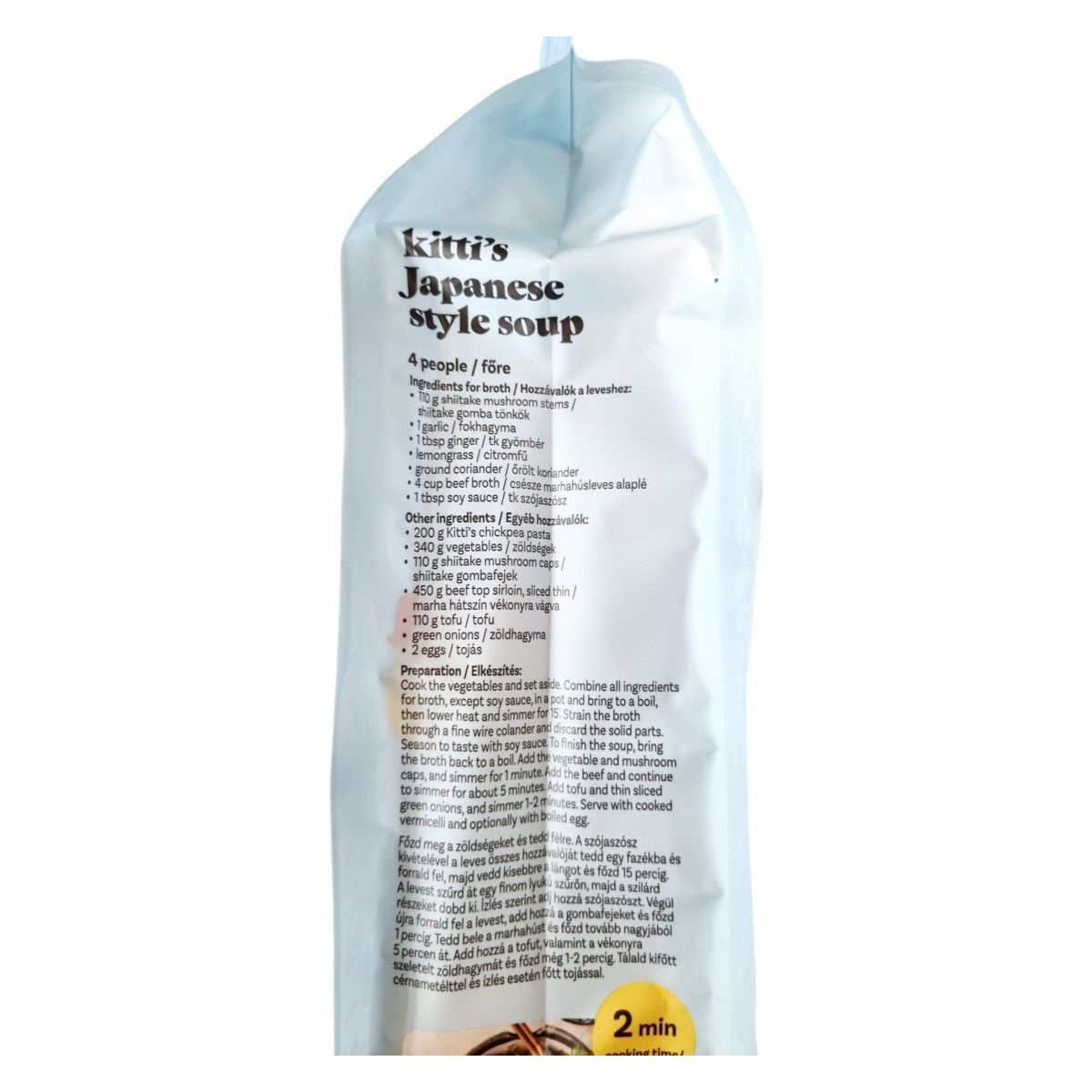 Egyéb hozzávalók: 200 g Kitti’s csicseriborsó tészta, 240 g vegyes zöldség, 110 g shiitake gombafej, 450 g marhahátszín vékonyra vágva, 110 g tofu, zöldhagyma, tojás.