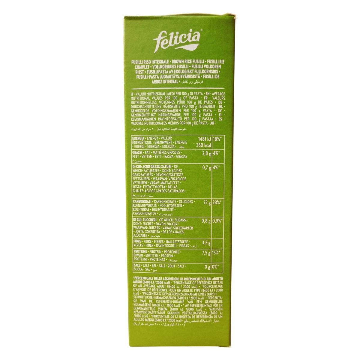 A Felicia Bio barnarizs fusilli egy organikus, gluténmentes tészta, amelyet Olaszországban gyártanak. Kiváló rostforrás, és mindössze 7 perc alatt elkészíthető. A termék 100% bio barnarizslisztből készül.