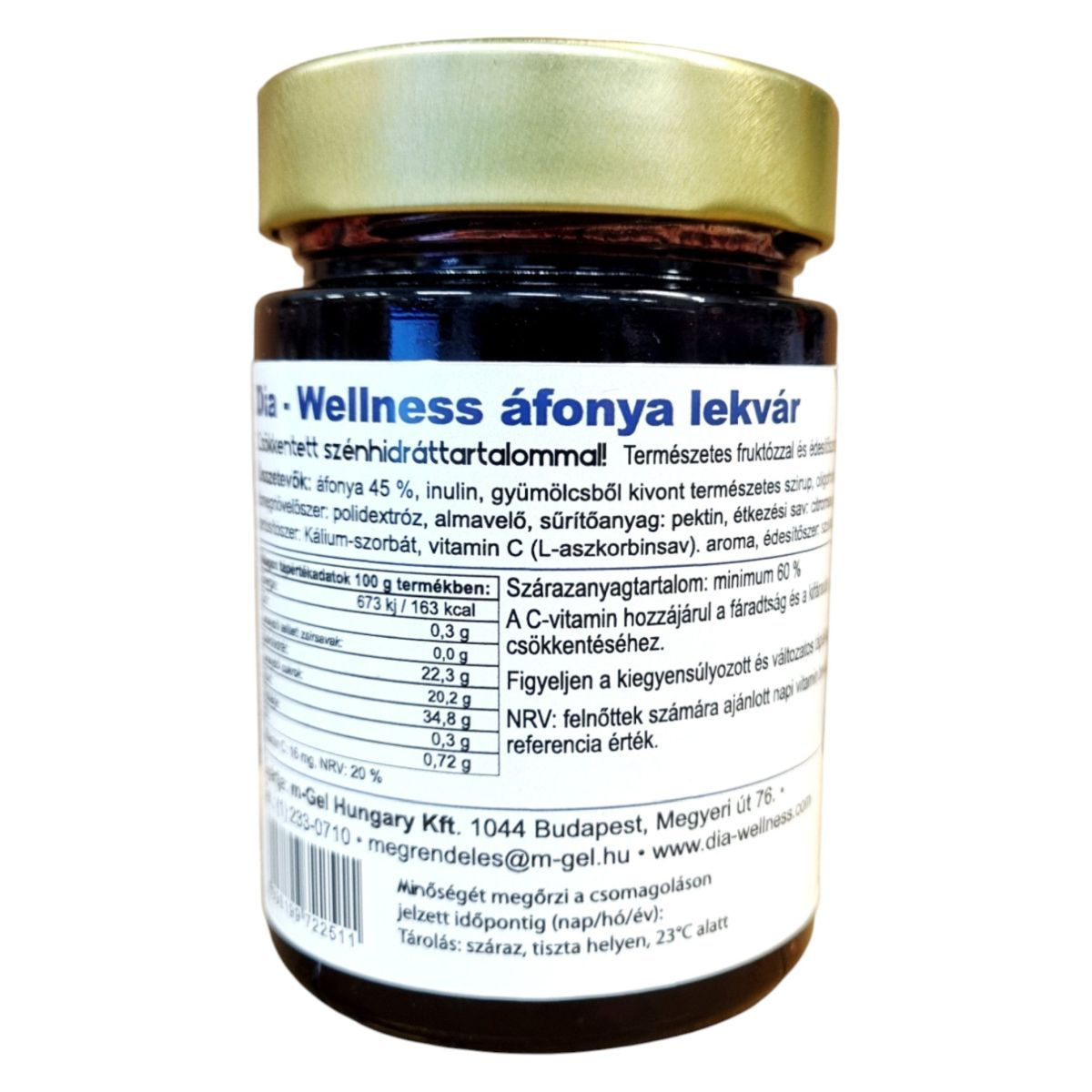 A Dia-Wellness áfonya lekvár egy különleges termék, amely csökkentett szénhidráttartalommal és természetes fruktózzal készül. Az áfonya 45%-os tartalma mellett inulint és polidextrózt is tartalmaz, amelyek hozzájárulhatnak a termék rosttartalmához. A lekvár nem tartalmaz hozzáadott répacukrot, így ideális lehet azok számára, akik low-carb étrendet követnek. A termék C-vitamin tartalma támogathatja a fáradtság csökkentését, de fontos a kiegyensúlyozott táplálkozás fenntartása. A lekvár minimum 60% szárazanyagtartalommal rendelkezik, és a m-Gel Hungary Kft. gyártja Budapesten.