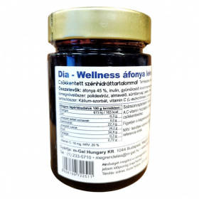 A Dia-Wellness áfonya lekvár csökkentett szénhidráttartalommal rendelkezik, természetes fruktózzal és édesítőszerrel készül. Nem tartalmaz hozzáadott répacukrot, így ideális választás lehet low-carb étrendet követők számára.