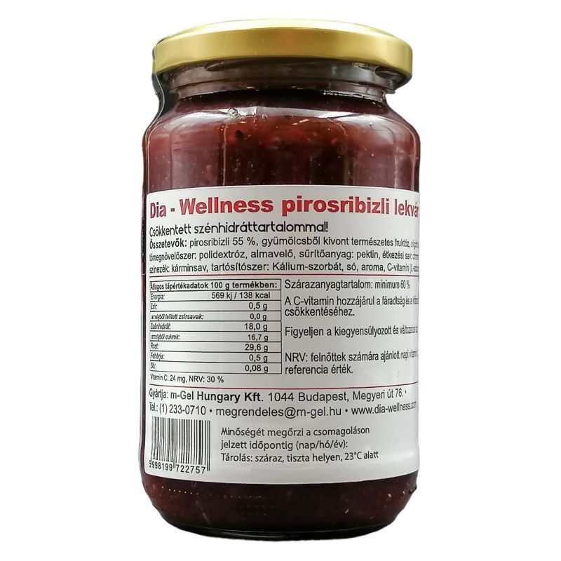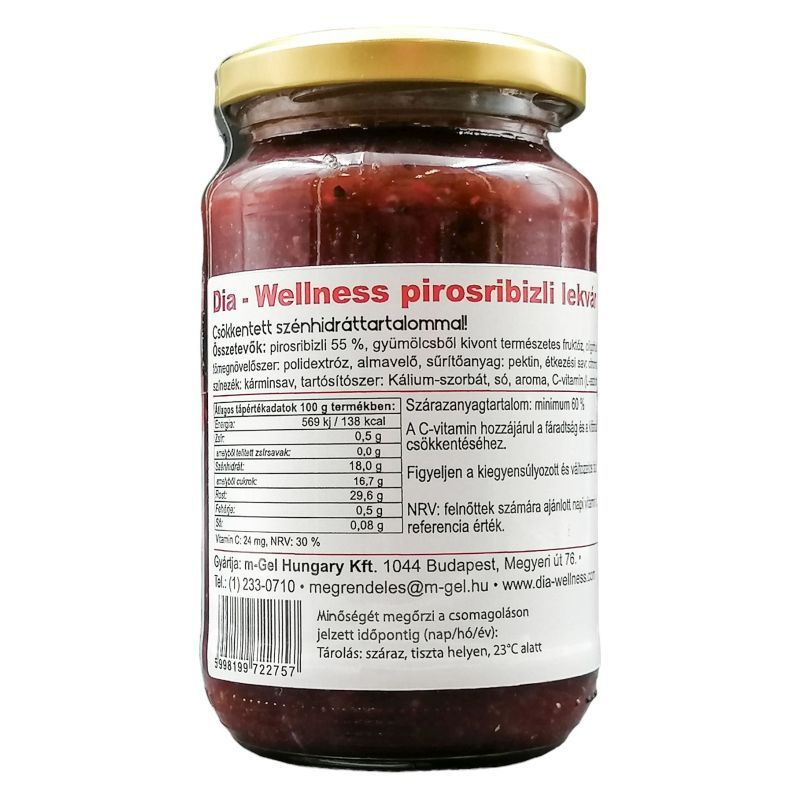 Összetevők: pirosribizli (50%), gyümölcsből kivont természetes szirup, inulin, tömegnövelőszer: polidextróz, sűrítőanyag: pektin, étkezési sav: cittromsav, aromák, színezék: carmin-vörös.