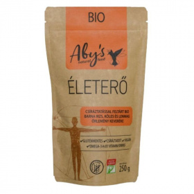 Az ABY Bbio mesterkeverék - bio csíráztatott barna rizs, köles-, arany lenmag őrlemény keveréke. Omega - 3 zsírsavakban gazdag, B-vitaminokat tartalmaz. B1-vitamin hozzájárul az idegrendszer normál és a szív megfelelő működéséhez. Emészthető formula. Élelmi rostban gazdag. A csíráztatás során aktiválódó enzimek hatására, a szervezetünk számára könnyen hasznosítható ásványi anyag-, vitamin-, szénhidrát-, esszenciális aminosav- és zsírösszetétel alakul ki. A csírázás hatására a gabona magokban található emésztést gátlók lebomlanak, így javítva a gabona meglévő kiváló tulajdonságait. A B1-vitamin részt vesz a normál energiatermelő anyagcsere- folyamatokban, hozzájárul az idegrendszer normál és a szív megfelelő működéséhez. A B6-vitamin hozzájárul a fáradtság csökkentéséhez. Az Omega-3 megnevezés a többszörösen telítetlen zsírsavak egyik csoportját jelöli. Az Omega-3 zsírsavak fontos szerepet játszanak a szervezet számos élettani folyamatában. Az Omega-3 zsírsav (ALA) fogyasztása hozzájárul a vér normál koleszterinszintjének fenntartásához. A kedvező hatás 2 g alfa-linolénsav (ALA) napi bevitelével érhető el. Élelmi rostban gazdag. Összetevők: bio, csíráztatott gabona magvak őrleménye, barnarizs*(40%), aranyköles* (35%), arany lenmag őrlemény*(25%). * Ökológiai gazdaságból származó összetevő. Száraz, hűvös helyen tárolandó! Felbontás után napfénytől védve 1 hónapig fogyasztható. Átlagos tápérték 100 g termékben: Energia: 1651 kJ/349 Kcal, zsír: 14 g -amelyből telített zsírsavak: 1,3 g -egyszeresen telítetlen zsírsavak: 2,9 g -többszörösen telítetlen zsírsavak: 8,2 g, szénhidrát: 49 g -amelyből cukrok: 1,2 g, rost: 12 g, fehérje: 12 g, só:<0,1 g. Vitaminok, ásványi anyagok 100 g termékben: tiamin: 0,33 mg. A többszörösen telítetlen zsírsavakból 100 g termékben: Omega-3 zsírsavak (ALA): 6,0 g, Omega-6 zsírsavak: 1,7 g.