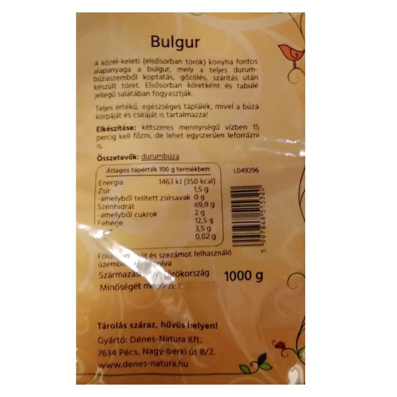Elsősorban köretként és tabulé jellegű salátában fogyasztják. Teljes értékű, egészséges táplálék, mivel a búza korpáját és csíráját is tartalmazza! Összetevők: durumbúza töret. Allergének a termékben: glutén. Felhasználási javaslat: Elkészítése: kétszeres mennyiségű vízben 15 percig kell főzni, de lehet egyszerűen leforrázni is. Milyen diétába illeszthető: vegán, vegetáriánus.
