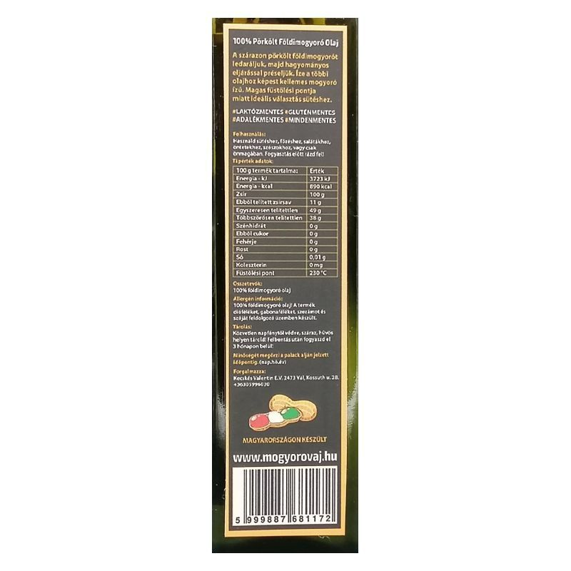 Miért jó a földimogyoró olaj? A mogyorót száraz pörkölési technológiával készítjük elő, így nem tartalmaz idegen olajat és adalékanyagot sem. Ezután a frissen pörkölt mogyorót azonnal ledaráljuk, majd kipréseljük belőle az olajat. Miért fogyassz földimogyoró olajat? 100%-ban földimogyoróból készült. Fizikailag, adalékanyagok nélkül finomított. Egészséges Omega-3-6 és Omega-9 zsírsavakat tartalmaz. Magyarországon készült termék. Erősíti az immunrendszert. Csökkenti a koleszterinszintet. Csökkenti a cukorbetegség kockázatát. Segít a zsír feloldásában és a fogyásban. Mivel igen magas (230 °C) a füstölési pontja, jól bírja a többszöri melegítést. Erős antioxidáns hatású. Hogyan használd? Használhatod sütéshez főzéshez. Salátákhoz ideális. Öntetekhez, szószokhoz remek választás. Akár önmagában is fogyaszthatod. Vegán, nincs hozzáadott só, olaj vagy cukor, gluténmentes, gazdag fehérjében és rostban, laktózmentes, mindenmentes, Magyarországon készült. Füstölési pont 230 °C. Tárolás: közvetlen napfénytől védve, száraz, hűvös helyen tárold! felbontás után fogyaszd el 3 hónapon belül! Felhasználás: használhatod sütéshez főzéshez. Salátákhoz ideális, öntetekhez, szószokhoz remek választás. Akár önmagában is fogyaszthatod.