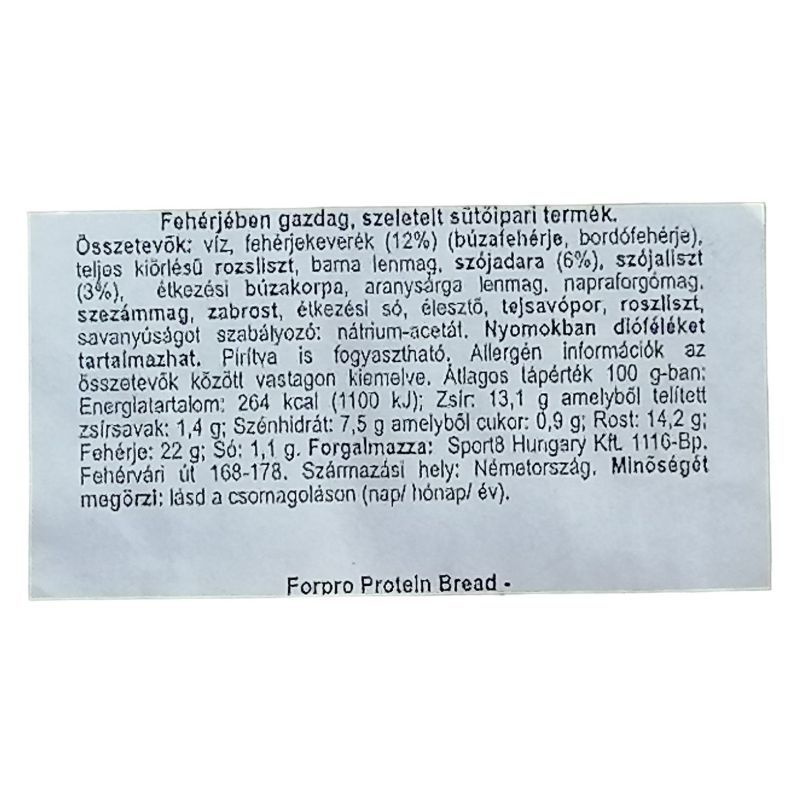 Mintenhol azt haljuk, hogy "de úgy kell a boldogság, mint egy falat kenyér". A Forpro Ptrotein Bread szeletei kivülről ropogósabbak belülről lágyak, szezámmag, lenmag és napraforgómag hozzáadásával. Ezt a kenyeret magasabb fehérjetartalmú étrendre készítették, de minden célra megfelel. 82%-kal kevesebb szénhidrátot, kevesebb cukrot tartalmaz, mint a szokásos kenyér, így segít elérni fitnesz céljaidat.