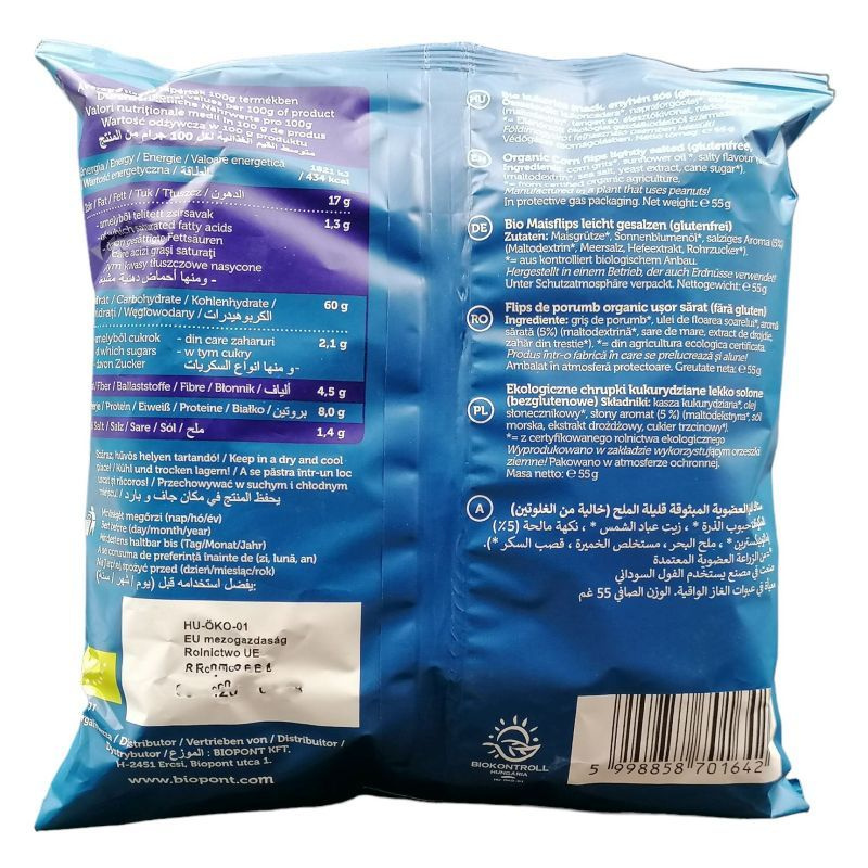Összetevők: kukoricadara*, napraforgóolaj*, sós ízesítő 5% (maltodextrin*, tengeri só, élesztőkivonat, nádcukor*) *Ellenőrzött ökológiai gazdálkodásból származó alkotó.