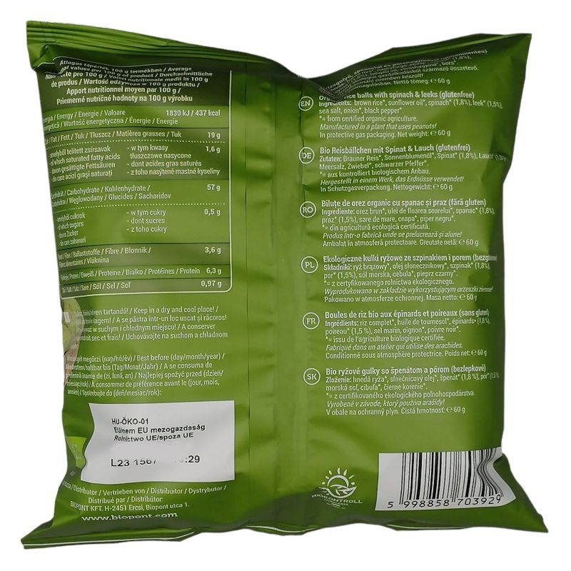A Kölesgolyók után a Biopont extrudált rizsgolyót kínál mindenkinek, aki szeretne egészségesebben étkezni! Különleges ízvilága a spenót és a póréhagyma izgalmas kombinációjának köszönhető. Miért rizs? Mert jelentős mennyiségű magnézium, vas, cink és vitamin található benne, mert magas proteintartalma miatt az egyik legjobb fehérjeforrás. Mert koleszterinbarát, mert gluténérzékenyek is nyugodt szívvel fogyaszthatják. A rizsgolyó gluténmentes, bio és emellett a vegetáriánus, illetve vegán étrendbe is tökéletesen beilleszthető!