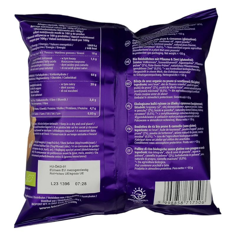 Összetevők: barna rizs*, napraforgó-étolaj*, agave por*, szilvapor*(2%), céklapor*, természetes szilva aroma, őrölt fahéj* (0,5%). *Ellenőrzött ökológiai gazdálkodásból származó alkotó.