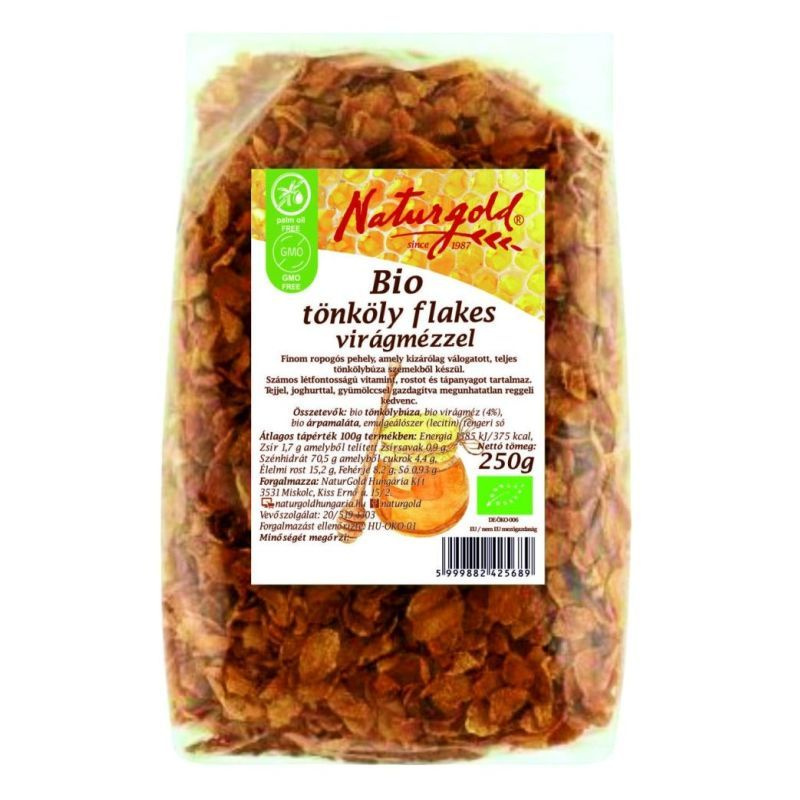 Naturgold bio tönköly flakes virágmézzel finom, ropogós pehely, amely kizárólag válogatott, teljes tönkölybúza szemekből készül. Kezdd a napot egy tál tönköly flakes gabonapehellyel, ami amellett, hogy számos létfontosságú vitamint, rostot és tápanyagot tartalmaz, tejjel, joghurttal, gyümölccsel gazdagítva megunhatatlan kedvenced lehet!